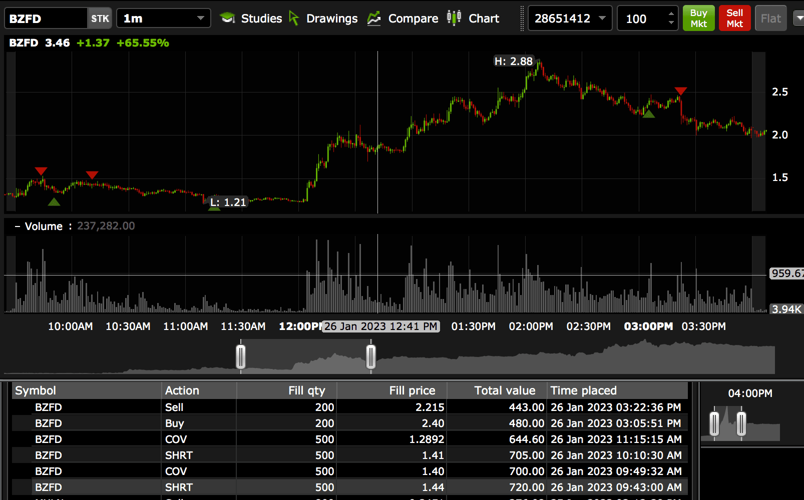 Happy with this execution as well - goal was to risk 'hod' around $1.50. Shorted @ $1.41, covered @ $1.2892. I will NEVER short a position and leave my computer. I was GLUED to my screen watching this & thank GOD i did because this thing got SQUEEZED hard in the early afternoon (shorts were out for lunch).