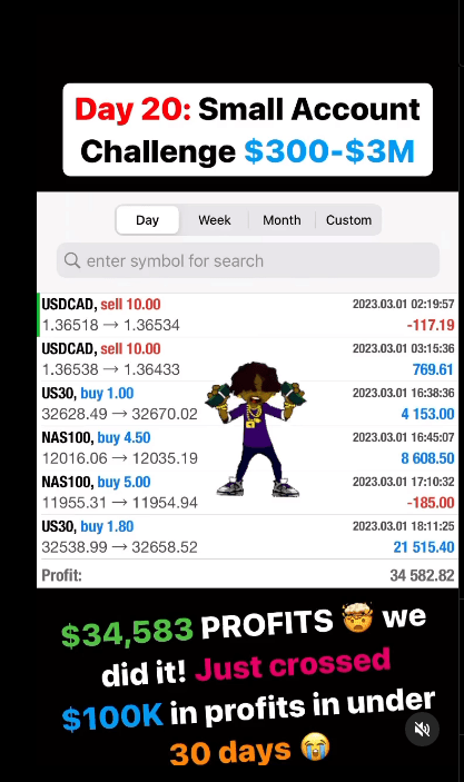 investorsdomain Day 20: Small Account Challenge $300-$3M $34,583 PROFITS 🤯 we did it! Just crossed $100K in profits in under 30 days 😠I beat my previous goal 🥅 BUT today mentally tested me as a trader! Extremely blessed my hard work has paid off 🔥 next stop $500K then $1M 💥 Provided Alerts 🚨 for members on each trade I took! My goal is to teach each and everyone of them this skill. First you learn THEN you EARN 🤑