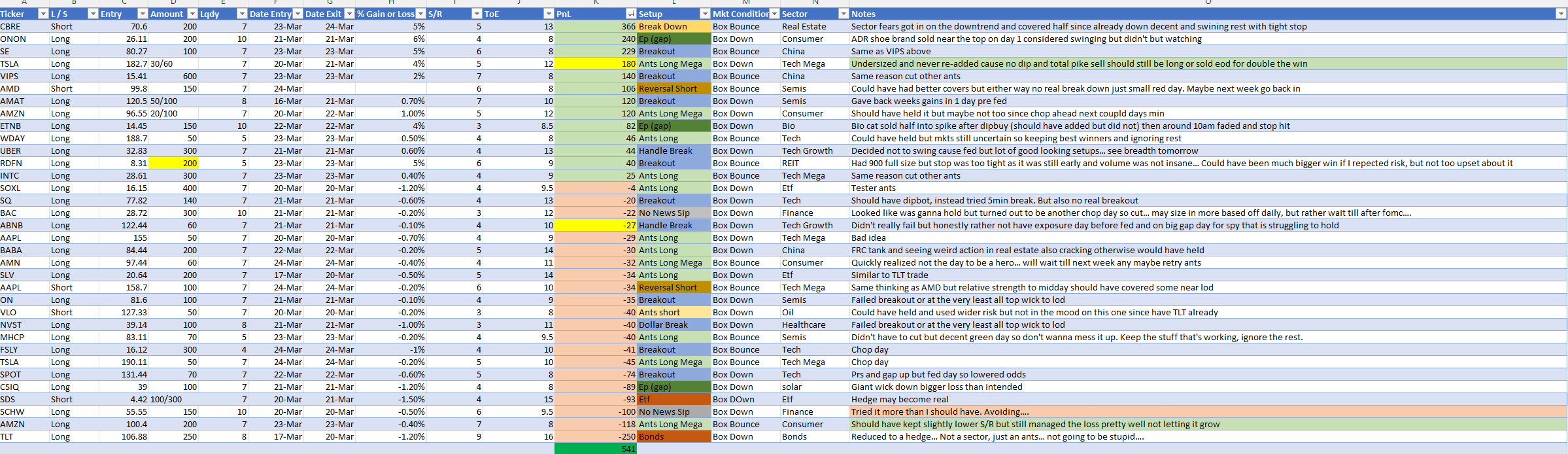 Still using meaningless size until get signs of improved swing conditions. Still entering most trades with intention to swing but am just on alert and cutting for scratches if no acting perfect. CBRE short was largest win for the week but still with small size and late entry. TLT got overconfident in idea and biggest loss. Will be uploading like this from now on.