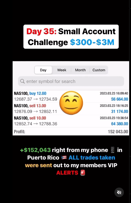 Day 35: Small Account Challenge $300-$3M +$152,043 right from my phone ๐ฑ in Puerto Rico ๐ต๐ท ALL trades taken were sent out to my members VIP ALERTS ๐จ while haters ๐คก will say itโs fake you cannot fake my entry alerts ๐จ to hundreds of members in my group ๐ค BIGGEST DAY with account and to think I started with $300 ๐