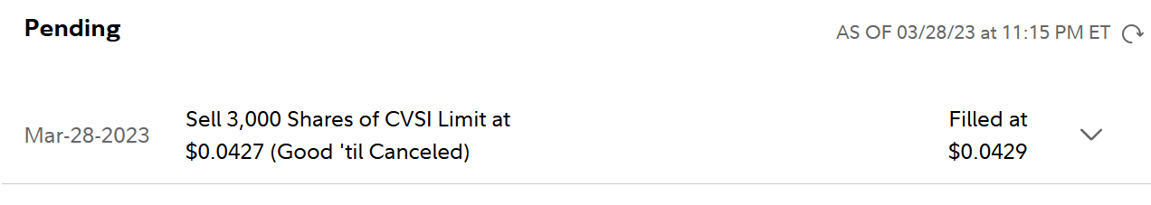 I got in this trade because of the STTBN alert regarding patent PR. Dip bought 3/23 9:23 $0.0425 3k 15% off 9:06 $0.05 HOD. Price went sideways & became range bound on low volume. I had set a Limit Sell at $0.0468 & 3/24 HOD got to $0.0464 argh! I got on the Ask at $0.0427 inside the $0.0423-$0.0431 spread & Fidelity got me out 3/28 14:30 $0.0427 1k & 14:47 $0.043 2k.