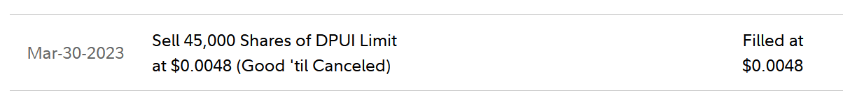 I got in this trade because I made 27% avg on 3 trades on 3/16, 10% on 3/23, & 11% on 3/29. It has very low volume now but is trading in a $0.0038-$0.0054 channel. Bought 3/30 $0.0043 using a pre-set Limit Buy. I immediately put on the Ask for a 10%+ win at $0.0048 & Fidelity got me out 3/31 $0.0048. No more trades on this until volume returns.