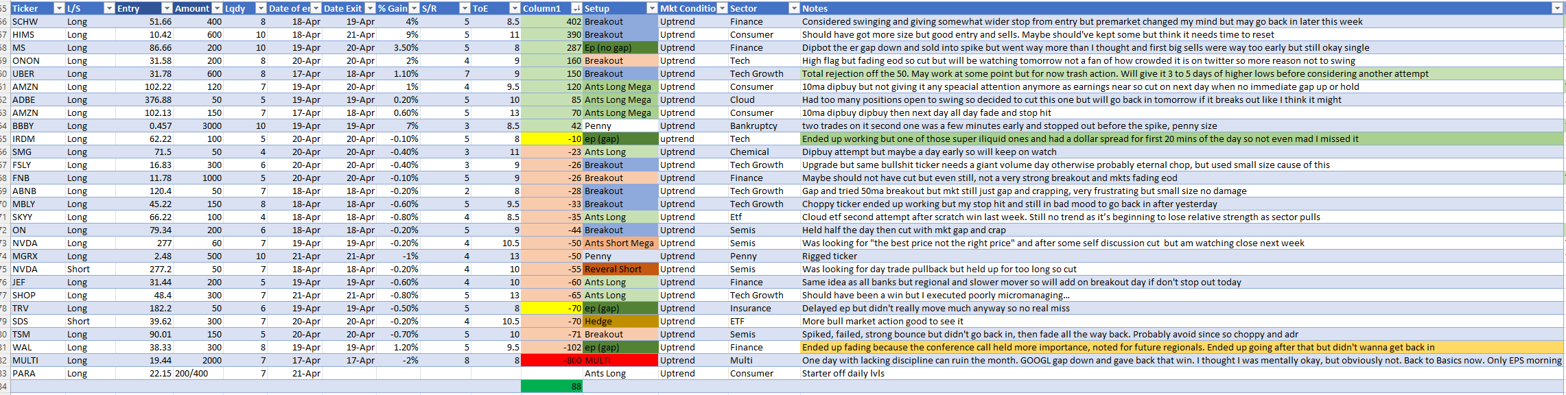 Monday shot myself in the foot, GOOGL gap down thought it didn't affect my mentality then found myself trying to get it back and dug a hole deeper. Would have been okay green week with some breakouts working and ants but not so. Friday was dumb too but no real damage (Mon 500 red day but says 800 cause includes GOOGL gap down when gave back some swing profits on it). Eps were best last quarter but now kind of choppy, but breakouts and ants working better. Funny
