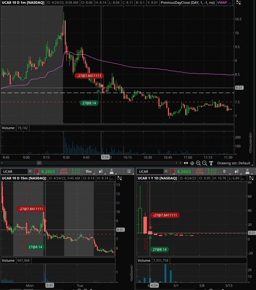 MON, 24APR_ [9:56am: Entry @ $8.14] _ [10:00am: Exit @ $7.84] ........................................................................................................................................................................................................................................................ Notes: {Speculative, -3.7%} Thought there could be a little bounce near r/g level, which did happen, but I entered too early.