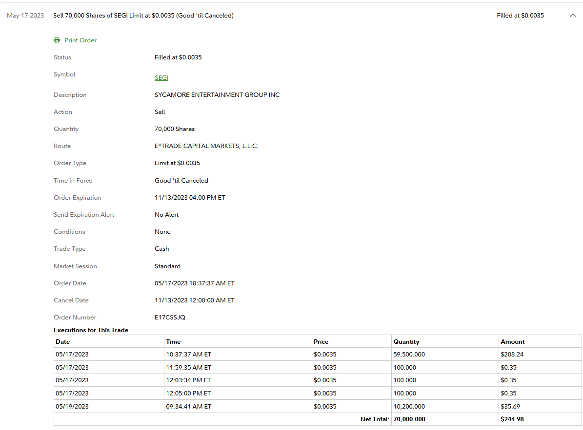 SUPER SALE STRATEGY per my 2/27/21 Profitly blogpost. Dip bought 5/15 8:39 $0.0029 70k shares 56% off 5/11 $0.0067 HOD. On 5/17 it looked like the bounce wasn't going to be a big one so I put on the Ask for the 20% win & Fidelity got me out 5/17 9:37-11:05 & 5/19 8:34 at $0.0035.