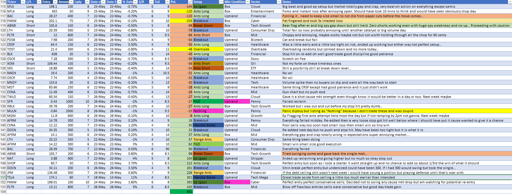 Super annoying week PNL was very choppy, green, red, green, red, but thankfully decent green day Friday with PLTR blow off. See a ton of stuff I wanna swing but 3 day weekend and Debt Ceiling deadline next week so just day trading until that's over with... Had perfect entry on JPM range anticipation swing entry but yeah no swings with that, so took the single on it