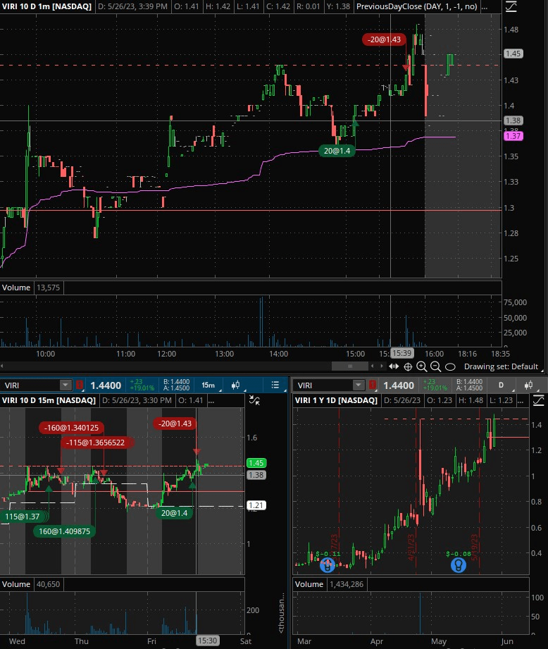 FRI, 26MAY_ [3:09pm: Entry @ $1.4] _ [3:48pm: Exit @ $1.43] ........................................................................................................................................................................................................................................................ Notes: {Speculative, +2.1%} In with very small size and sold prematurely, but it finally had the small break above 1.44 resistance that I was anticipating.