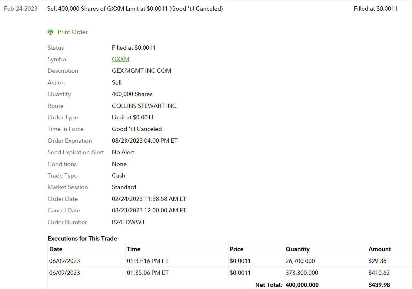 I got in this trade because it had spiked on AI PR & is a 3-time former runner since 3/9/22. Dip bought 2/24 8:44 $0.001 200k 33% off 8:35 $0.0015 HOD. Price fell so added 10:17 $0.0008 200k. Immediately set my Limit Sell for $0.0011 & moved on. Fidelity got me out 6/9 12:32/12:35 $0.0011 on another spike as former runners most often do.