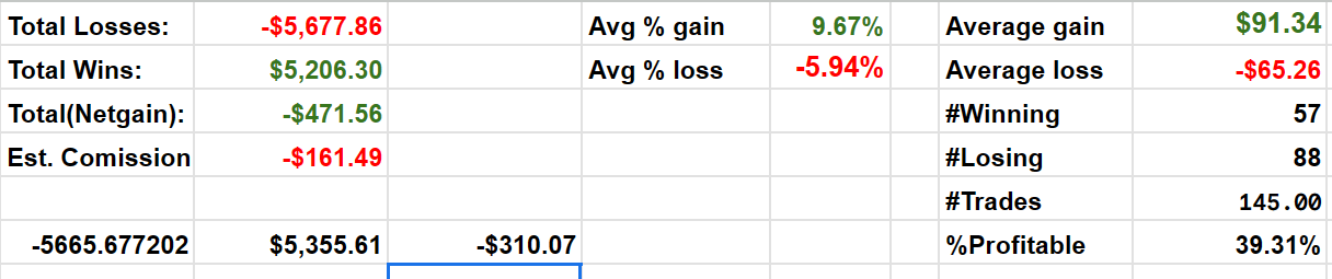 Overtraded this month, went way too big on subpar setups, did cut losses quickly overall but P&L brought down by undisciplined trades and sizing up on very speculative setups. More review to come but posted in chat my deficiencies. Positive no gigantic losses but goal over next 1-4 days is to refine spreadsheet to track setups better, automatically. Next month trade only best setups, track data better. Consistently size. Otherwise back to $200 max size.