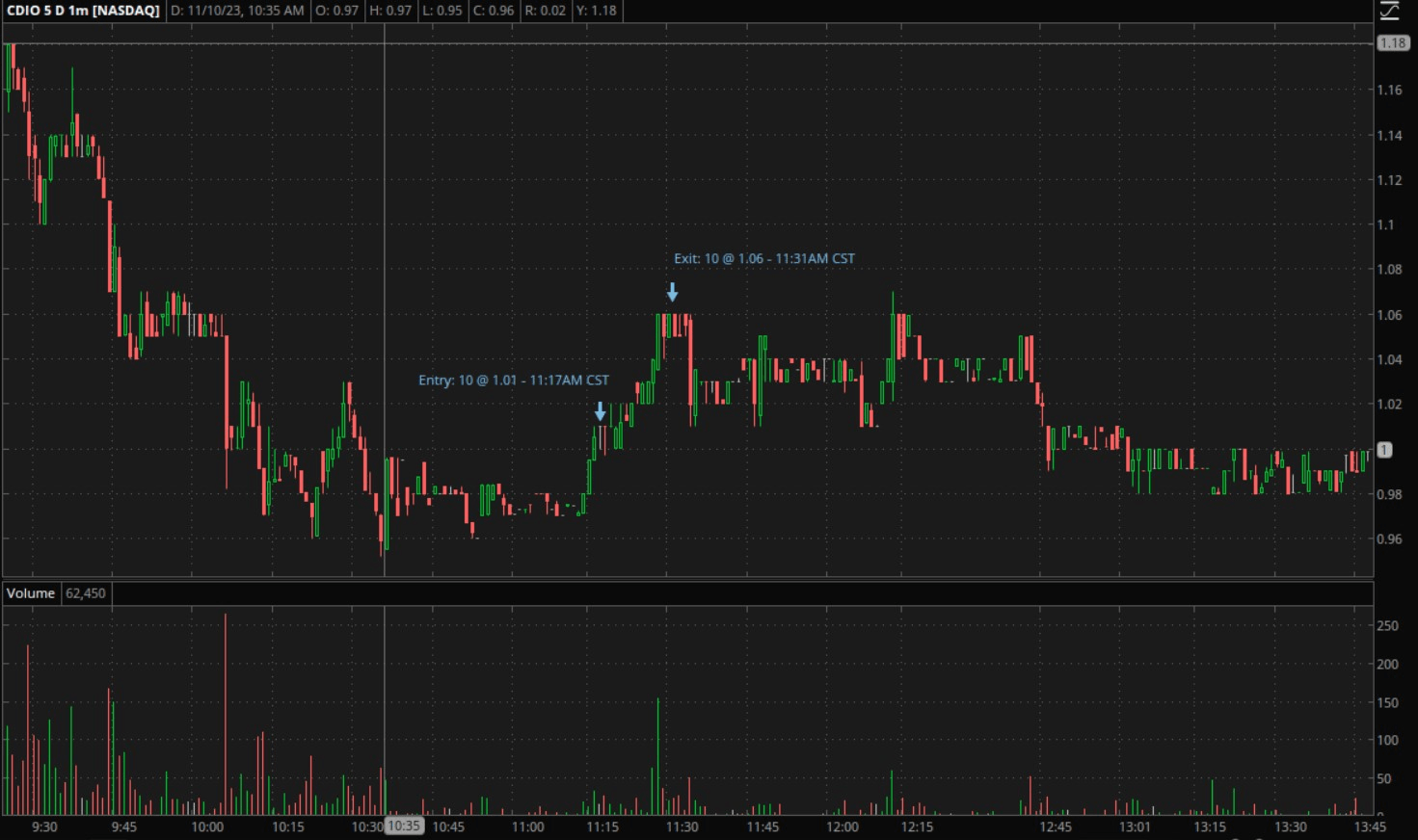 I decided to have another look at CDIO a few days later, not because I'm expecting it to take off or anything, but because I wanted to practice reading Level 2. In the heat of the moment, Level 2 is moving WAYYY too fast for me to keep up, simply because I haven't had enough practice with it. Since CDIO was still up a bit, and had a smaller amount of volume (considering my goal of learning L2 better), I got into it with 10 shares at 1.01, and ONLY watched L2 while I was in. Exited at 1.06