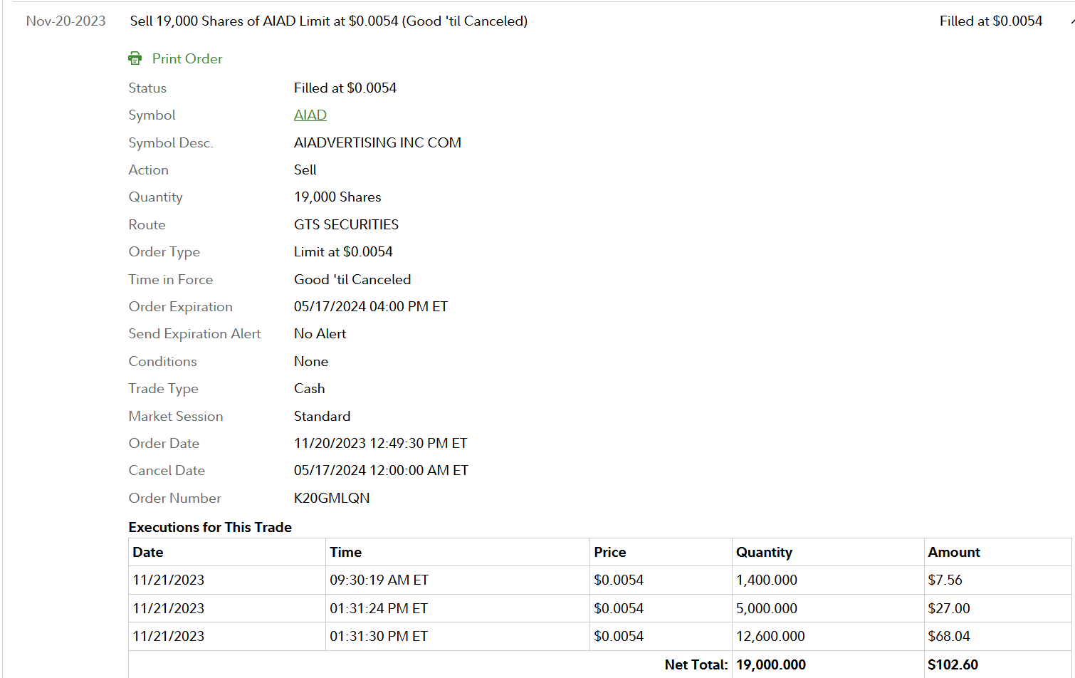 I got in this trade because it's a 13-time former runner since 10/25/21 & it's generally ranging, but low volume, $0.004-$0.006 on the 1-month daily. I got a partial fill 19k shares [wanted 30k] 11/20 11:27 $0.0045. I immediately set my Limit Sell for the 20% win $0.0054 first up on the Ask and Fidelity got me out 11/21 8:30 1.4k & 12:31 17.6k. Small size is the key to low volume plays as long as they're former runners.