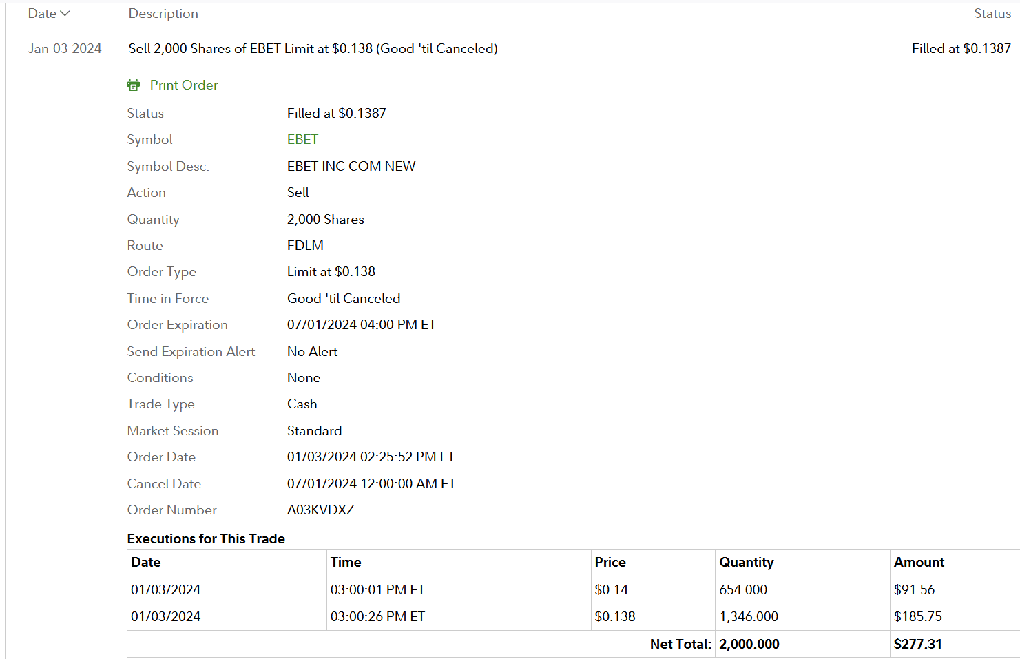 I got in this trade because it was OTC #1 Biggest % Gainer with Volume on 12/27 & I made 53% on it 12/28 so I thought it could bounce again. Dip bought 12:15 $0.12 2k shares 25% off 8:30 $0.16 HOD & on the low side of the 4-day consolidation on the 5-day daily. Volume was very low with only 36 trades in 70 minutes so I got on the Ask for the 15% win & Fidelity got me out in two pieces 14:00 $0.14 654 shares & $0.138 1,346 shares.