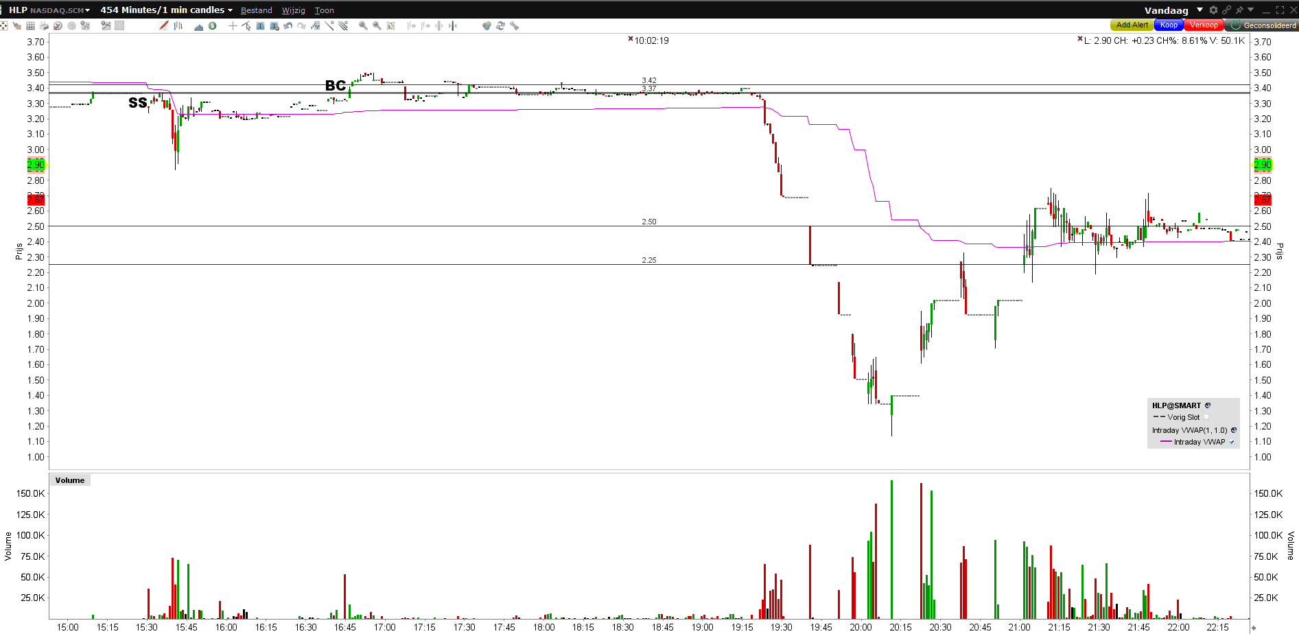 ENTRY: FRD, up 250% ong, blowoff gehad, oplopend volume, weinig cash en history met goede frd's. Alleen float 3 mil, maar trade niet zo. En zie geen dilution. Ik short onder r/g=3.37 na open op 3.30. Risk op YHOD. EXIT: Na kleine moring panic en rebound risk verlaagd naar HOD op 3.38. Filled op 3.40 nadat HOD brak. LES: Nadat ik wakker werd van mn dutje zag ik dat HLP geliquideerd was tot wel -60%. Had stock in verleden ook gedaan. In verleden brak het niet eerst YHOD, daarom riskte ik dat.