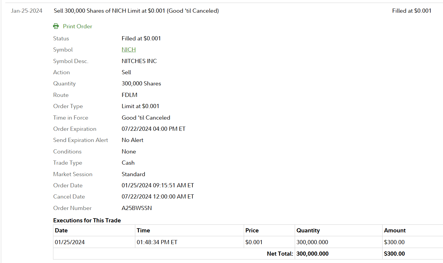 SUPER SALE STRATEGY per my 2/27/21 Profitly blogpost. Dip bought 1/24 13:08 $0.0008 53% off 1/12 & 1/16 $0.0017 HOD. Price held and slow bounce began. The 10-day daily seemed to suggest I could only expect to get $0.001 so I set my Limit Sell there and Fidelity got me out 1/25 12:48 $0.001. Price hit $0.0011 at 12:53 & $0.0012 at 13:02 briefly on low volume before back to $0.0011 holding now.