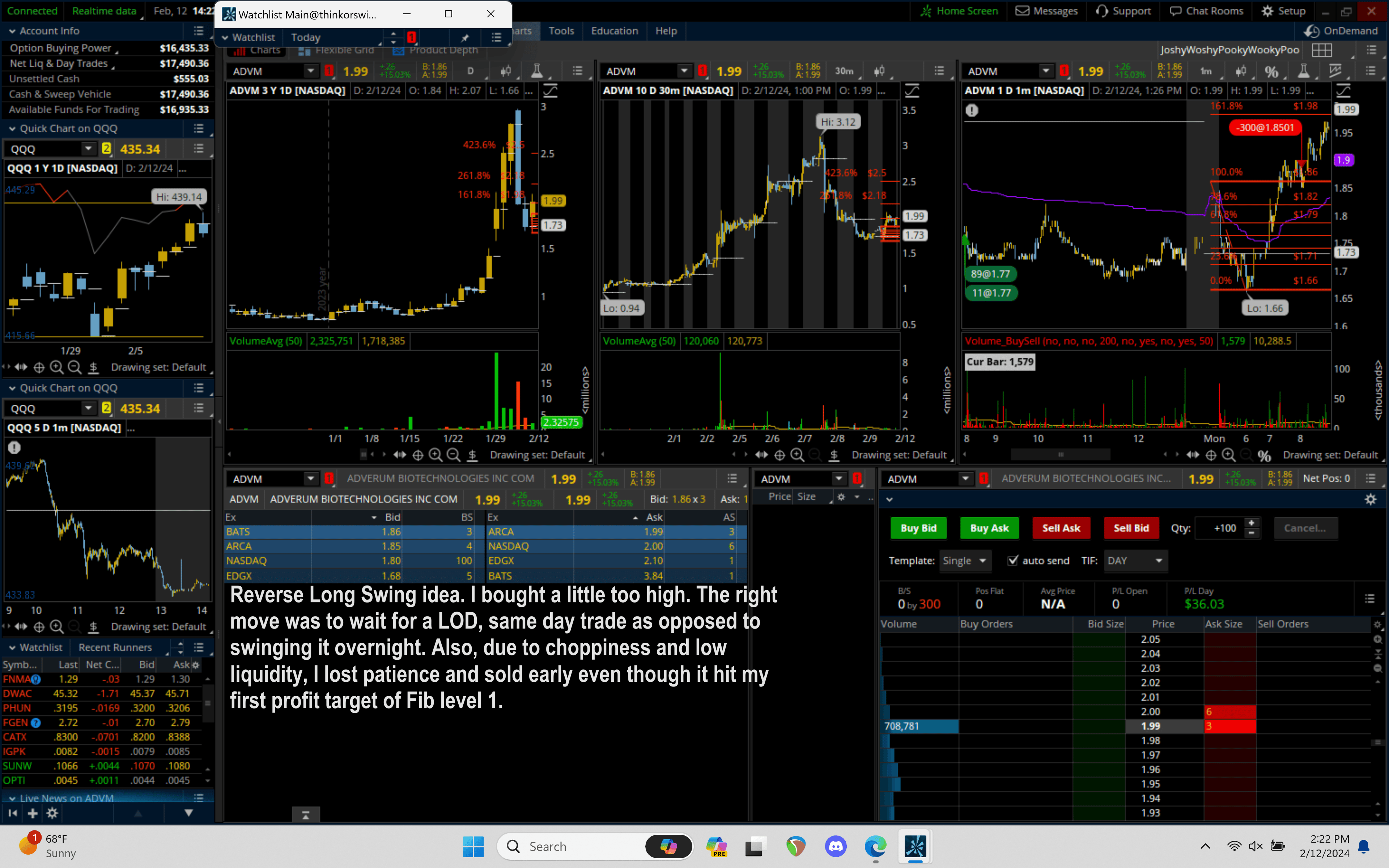 ENTRY: Reversal Long Swing. I entered too early. This could have been a LOD entry the following day instead of a swing trade. EXIT: I sold much too early because of sketchy liquidity. I needed to be more patient on my sell. I could have been break even on this trade if it went south. No need to take an early gain.