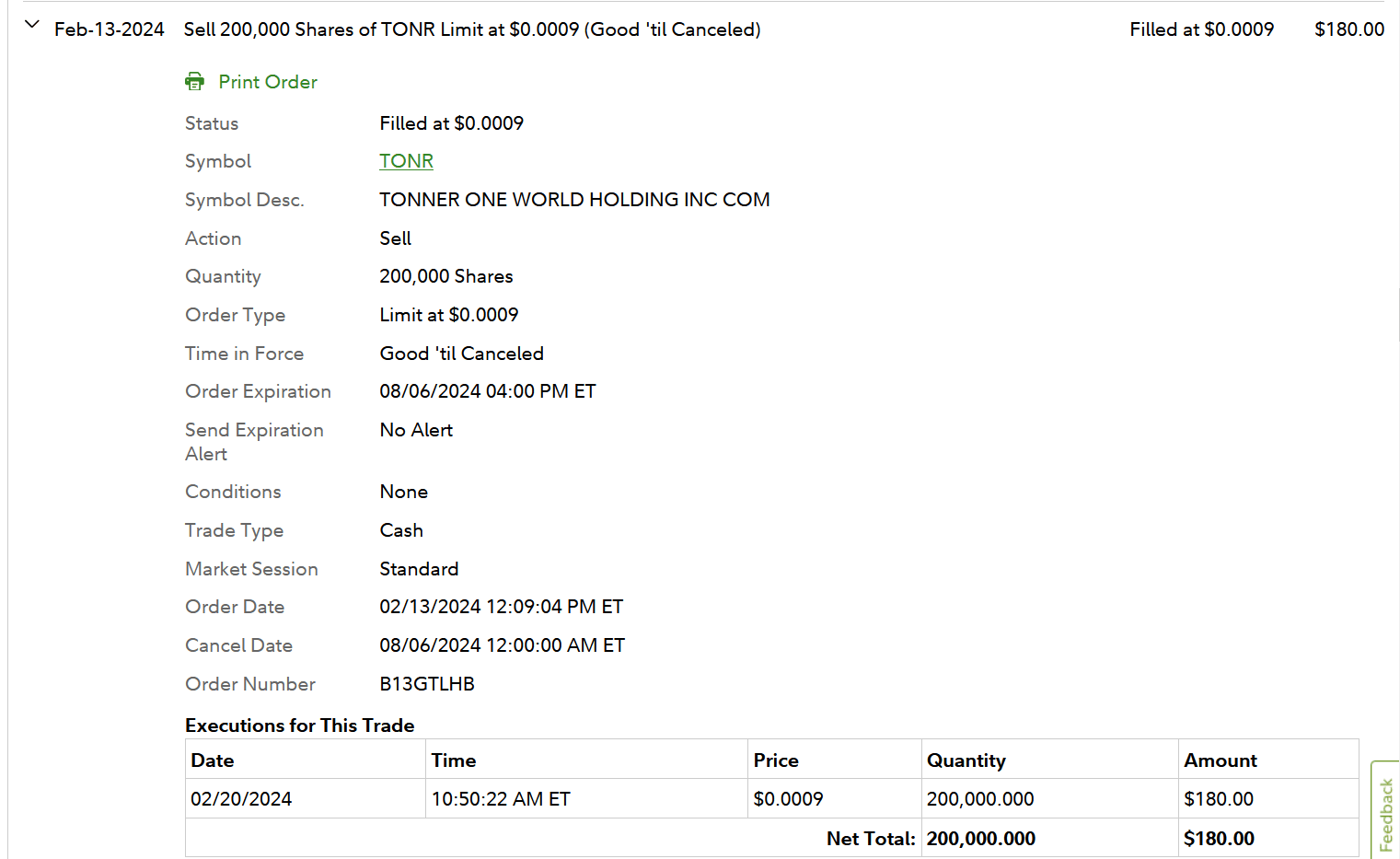 SUPER SALE STRATEGY per my 2/27/21 Profitly blogpost. Dip bought 2/8 12:20 $0.0008 47% off 1/31 & 2/1 $0.0015 HOD. Price bounced but only to $0.0009 which I could've taken almost any time 2/8 12:25-close but I thought it would go higher. Price fell to $0.0006 2/9-16 but I didn't add. Volume returned and I got out 2/20 9:50 $0.0009. Price hit $0.001 on the volume spike and is still $0.001 at 10:05.