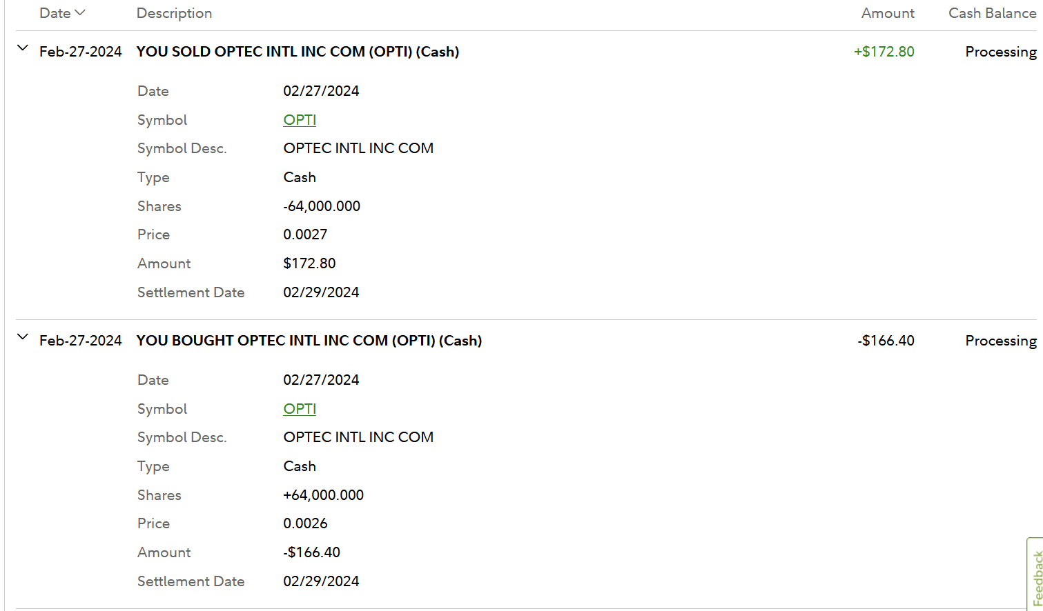 I got in this trade because it was OTC Top 2 Biggest % Gainers with Volume on 2/6+2/7 & is a 9-time former runner since 11/5/20. Dip bought 11:00 $0.0026 28% off $0.0036 HOD & at support on the 10-day daily. Price hit 11:35 $0.0024 & bounced to 11:50 $0.0027. For 1 hour the price couldn't get past $0.0027 so I got on the Ask there & Fidelity got me out 13:22 $0.0027.