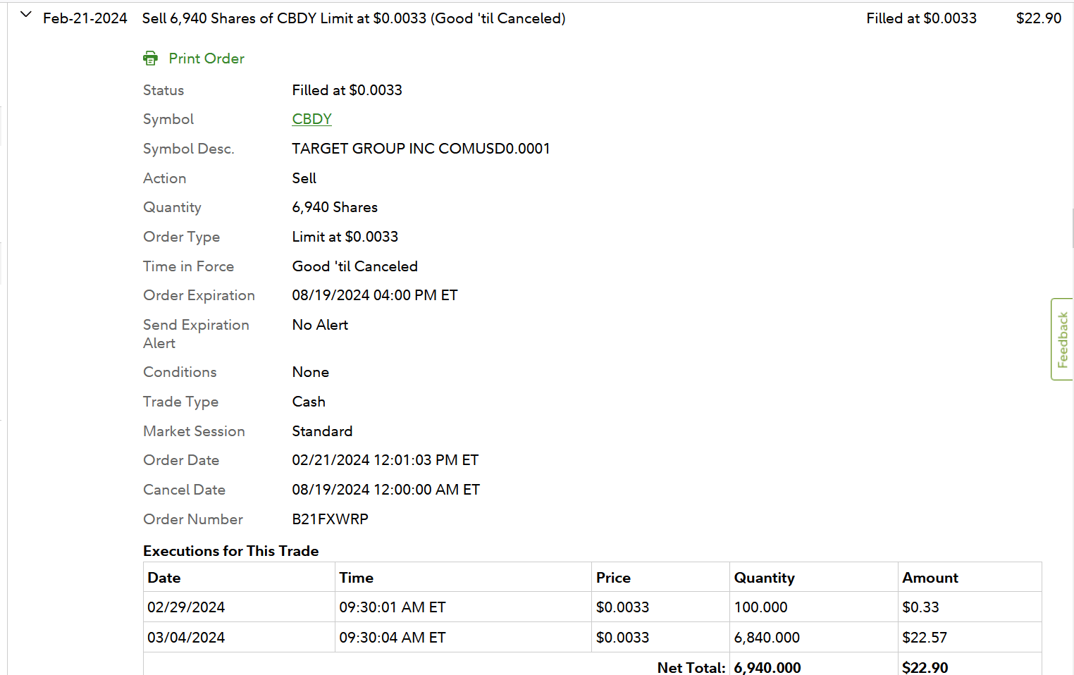 SUPER SALE STRATEGY per my 2/27/21 Profitly blogpost. Dip bought partial fill 2/21 8:30 $0.0022 6.94k shares [wanted 80k shares lol] 49% off 2/16 $0.0043 HOD. This is one of my favorite LOW VOLUME tickers that I know the long-term pattern for so patience is required. NOT SYKES APPROVED DON'T TRY AT HOME. I immediately set my Limit Sell for the 50% win. Fidelity got me out 2/29 8:30 $0.0033 100 shares & 3/4 8:30 $0.0033 6.84k shares.
