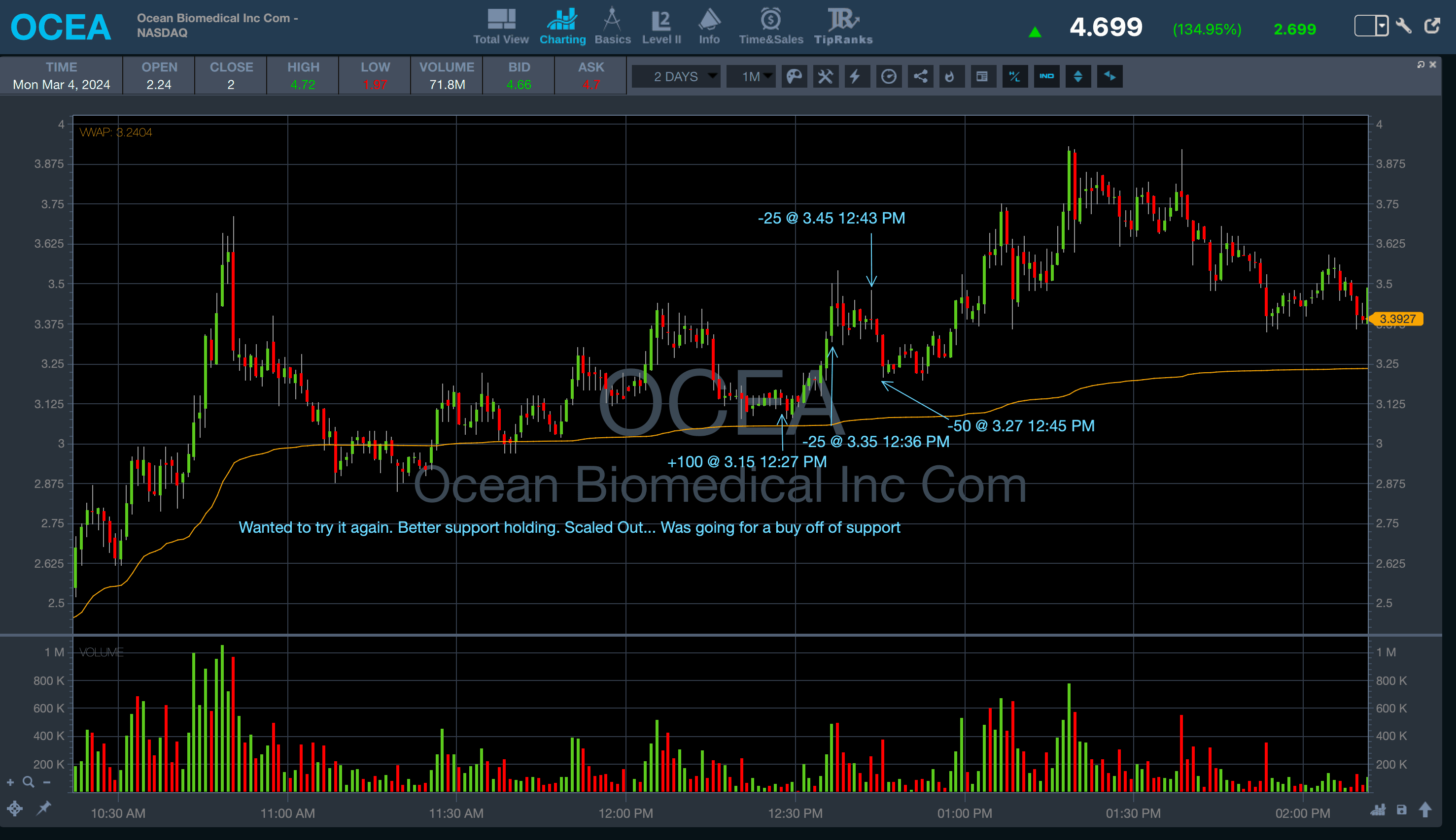8th trade today. Got an email alert that T. Sykes bought OCEA... You best believe I let that get the best of me & boost my ego because I was on the right track.. getting my timing down. And then seeing Tim was in it... I wasn't going to stop. Greed and Ego got me here. Bought on another little support dip. Scaled out. Sold into strength and then when it was failing.