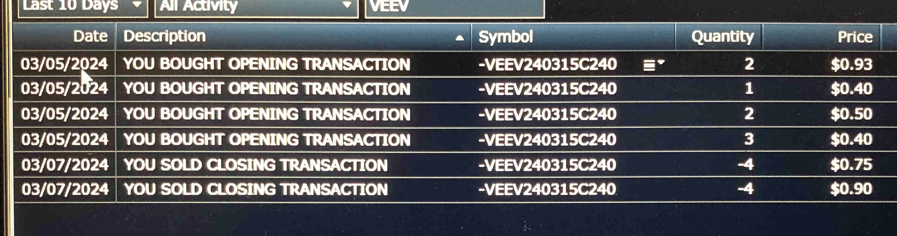 Entry comments: Watchlist, multi-green-day continuation. Volume spikes, news, analyst ratings. Risk .20, reward .40. (ATR 5.37) Waited for pullback, entered +2 @ .93, +2 @ .50, +4 @ .40. (C240: Delta .15, Th -.14)