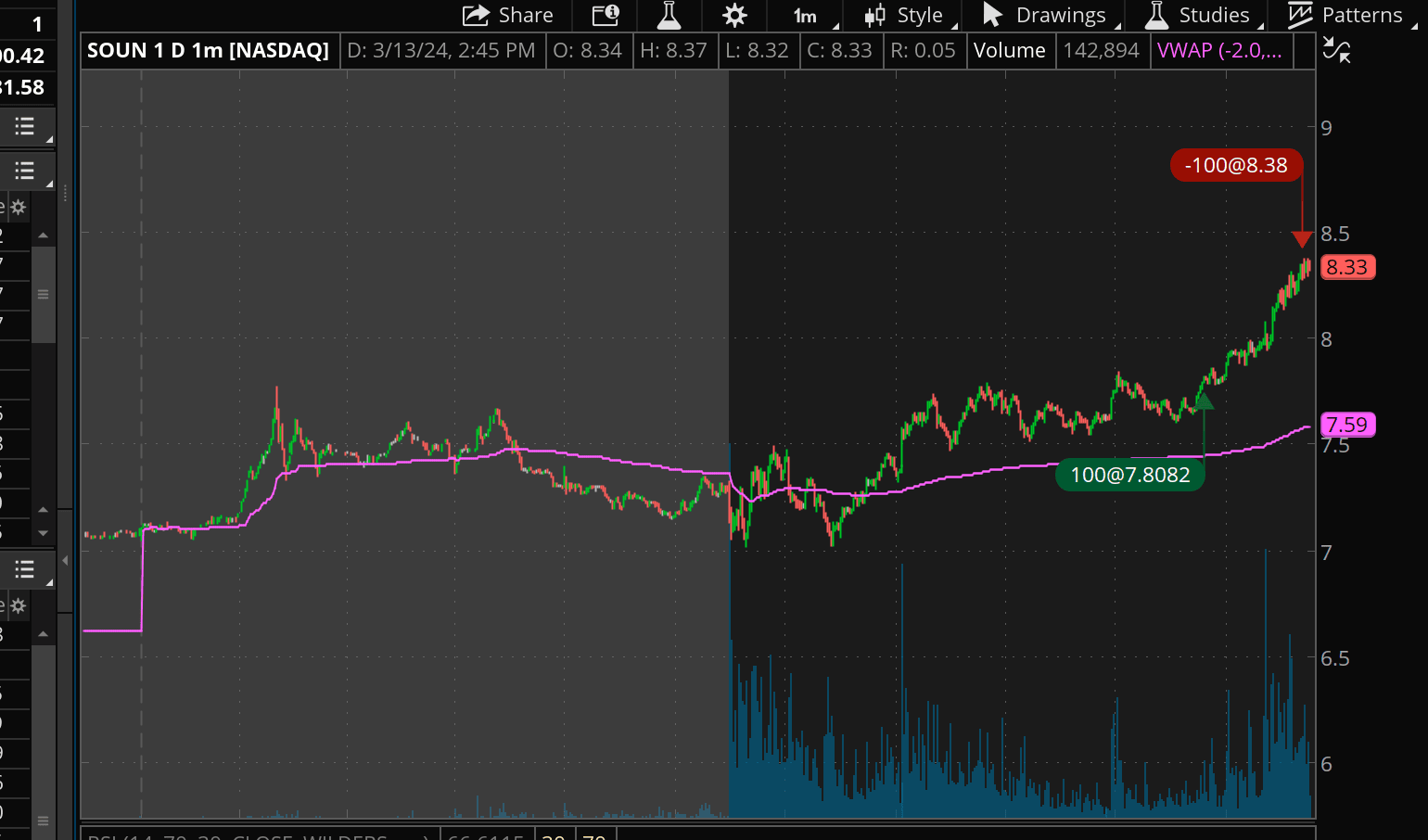 Trading silly small as I get back into it and study. Caught this as it was hitting the upper end of a channel it'd been in since about 11am. Looked like it might break hod which to me meant a good possibility of a multi-day b/o with solid upside, especially if shorts had piled in already. Risk was $7.60. Plan was always to take profits around 8.4 or less if it seemed to be heading back down. Was tempted to just let it run but that tends to burn me.