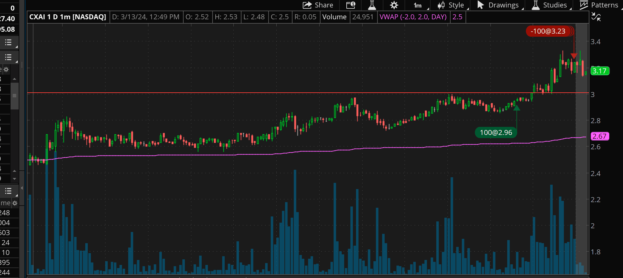 Trading silly small while I get back into this/study. The pop back above vwap in the PM to this AM's highs grabbed my attention around 2pm. I kept an eye on it with $3 as a key level for b/o. It was holding into the close so I bought with 2.86 risk (low 2.80's intra-day supp/res level). Was aiming for 3.36 and wasn't confident about holding overnight