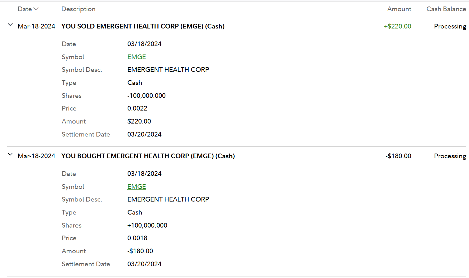 SUPER SALE STRATEGY per my 2/27/21 Profitly blogpost. Dip bought 12:46 $0.0018 58% off 3/14 $0.0041 HOD. Price bounced to 13:06 $0.0025. I thought it could get to $0.0027ish but then 1.1M on the $0.0025 Ask with Bid support at $0.0019 fading so I got on the Ask at $0.0022 & Fidelity got me out 13:14. Price is $0.0025 at 13:17.