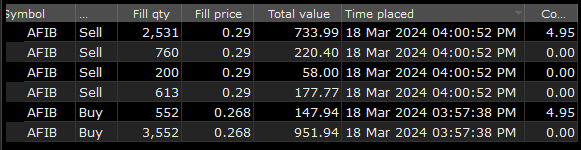 Subtracted $9.90 for comms from profit/loss and traded breaking news patent play sold too soon as went up to .325, but locked in gains to move my account upwards , was 8 seconds away from .31 ish, didn't recognize that the minute was about to move to 401 and that would have made more gains agh well.