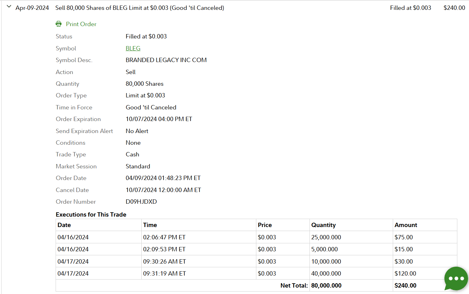 I got in this trade because it's a 5-time former runner since 10/17/23 with revenue PR out today. Dip bought 4/9 12:33 $0.0025 80k 28% off 9:02 $0.0035 HOD. I immediately set my Limit Sell for the 20% win. Price hit $0.003 14:53-14:54 & again 4/10 8:30/8:39/8:46 for ~150k shares but didn't execute me argh! Price went sideways $0.002-$0.0026 not low enough to justify another dip buy so I was patient. Fidelity finally got me out 4/16 13:06/13:09 & 4/17 8:30-8:31 per the attachment.