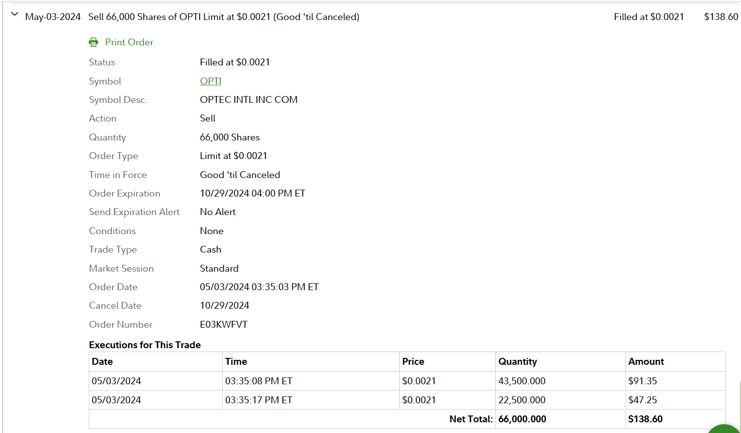 SUPER SALE STRATEGY per my 2/27/21 Profitly blogpost. Dip bought 5/1 13:03 $0.002 50% off 4/24 $0.004 HOD. Price bottomed 13:03 $0.0016 but bounce couldn't get over $0.002. I considered an add at $0.0016 on 5/2 & 5/3 as that bottom held but never did. When I saw the Bid eroding 88k at $0.0021 vs Ask 2.3M+ at $0.0022, I got out 5/3 14:35 $0.0021. Definitely not the trade plan but that's what the market gave me.