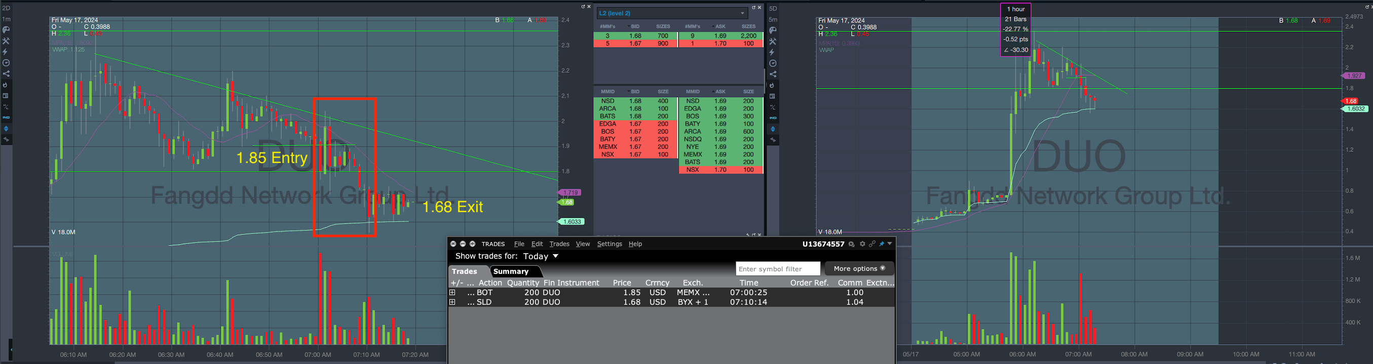 My entry tested out my theory that the stock if it could hold the 1.80 range, might push back to 1.90 and then possibly 2. That was wrong. All the indicators pointed to a bearish move when I entered. The 7 a.m. crowd didn't push the stock up, the trend line was bearish, and the support at 1.80 was tested and showed weakness. I also entered the trade on a red 5-minute candle. Looking back at the trade, this was a bad one. I also found myself holding and hoping and not cutting losses fast.