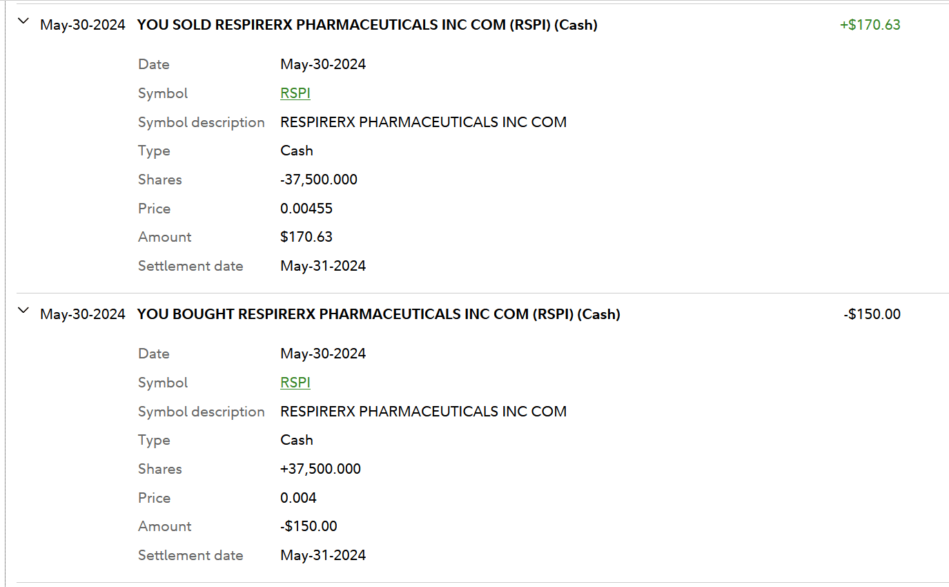 I got in this trade because it was the OTC Biggest % Gainer with Volume on 5/29 & is a 4-time former runner since 11/29/23. Dip bought 10:15 $0.004 37.5k [partial fill wanted 40k] at 8:39 $0.004 LOD. The price bounced to 10:17-10:19 $0.0046. When I saw the momentum change on Level 2, I got out 10:20 $0.0046. Price is $0.0038 at 10:50.