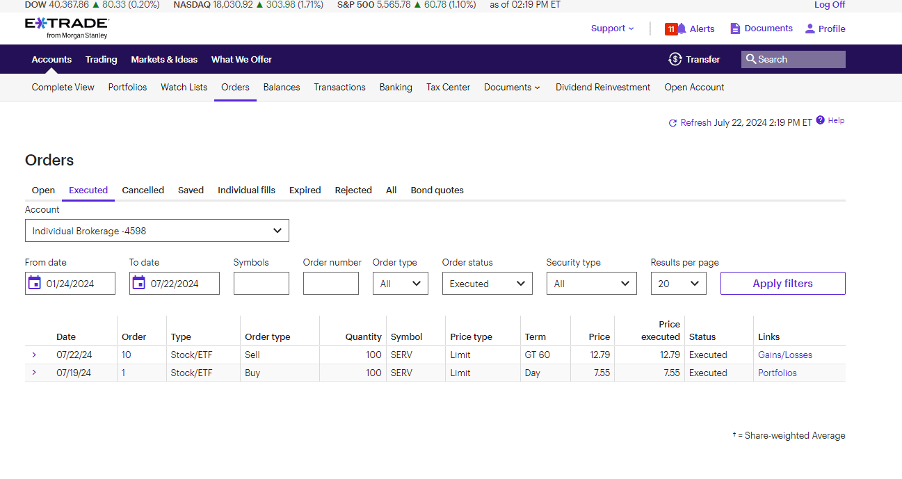 Entry comments: took a small position on SERV I saw that it could have legs due to news and hype and held it over the weekend. had it Exit comments: Sold on the exhaustion of the morning run up. Didn't want to press my luck anymore and turns out it cracked shortly after back down to below $10. Great first official trade. Looking forward to finding more setups like this one.