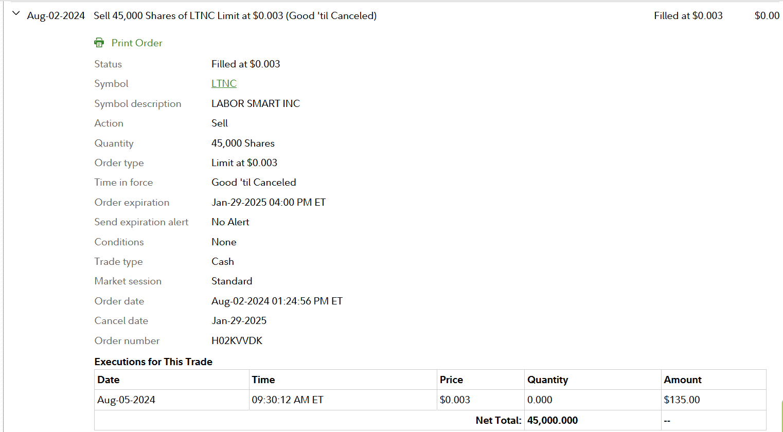 I got in this trade because, though it's generally a low volume play, I know the chart, made ~40% on it 7/8, & think I can do it again. Dip bought 8/2 11:57 $0.0025 at support area on the 2-month daily. That was LOD so good entry. I immediately set my Limit Sell for for the 20% win & Fidelity got me out 8/5 8:30 $0.003 which was HOD. Perfect.