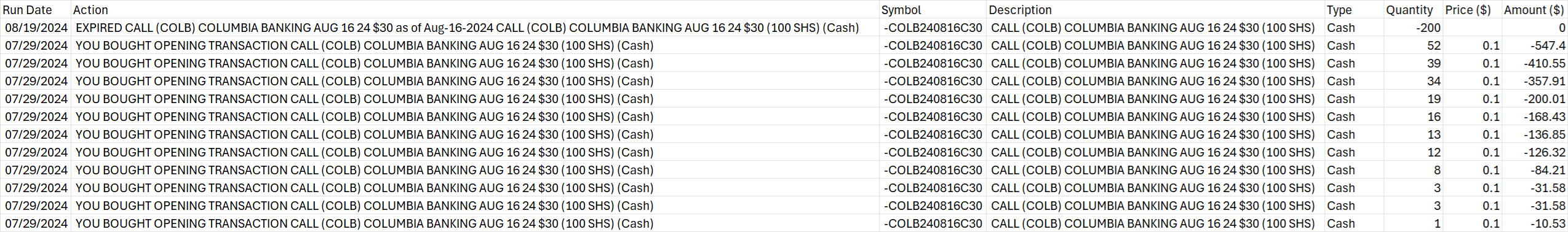 Gamma Code Recommendation Aug 16 2024 expiration, $30 Call option Symbol: COLB240816C30 Entry: 200 Contracts (20,000 Shares) @ $0.10 per contract, Target $0.30 per contract, Stop $0.10 Exit: 200 Contracts (20,000 Shares) @ $0.00 per contract, contract expired for a loss. Held too long and did not exercise, thinking it would come back.