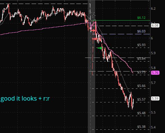 Absolutely insane mover. I f'n nailed this entry and risk level, but I have never piked a trade so bad in my life. I followed my plan and even got 1.1R when I intended to get 1, but as it stands, this could have been a 5.6R win without adding/lowering risk again and it's breaking new lows as I type. This stock BARELY even qualified to be traded, and for some reason, it's those that often offer the best opportunities. Got my goal, but man what really could have been on this one.