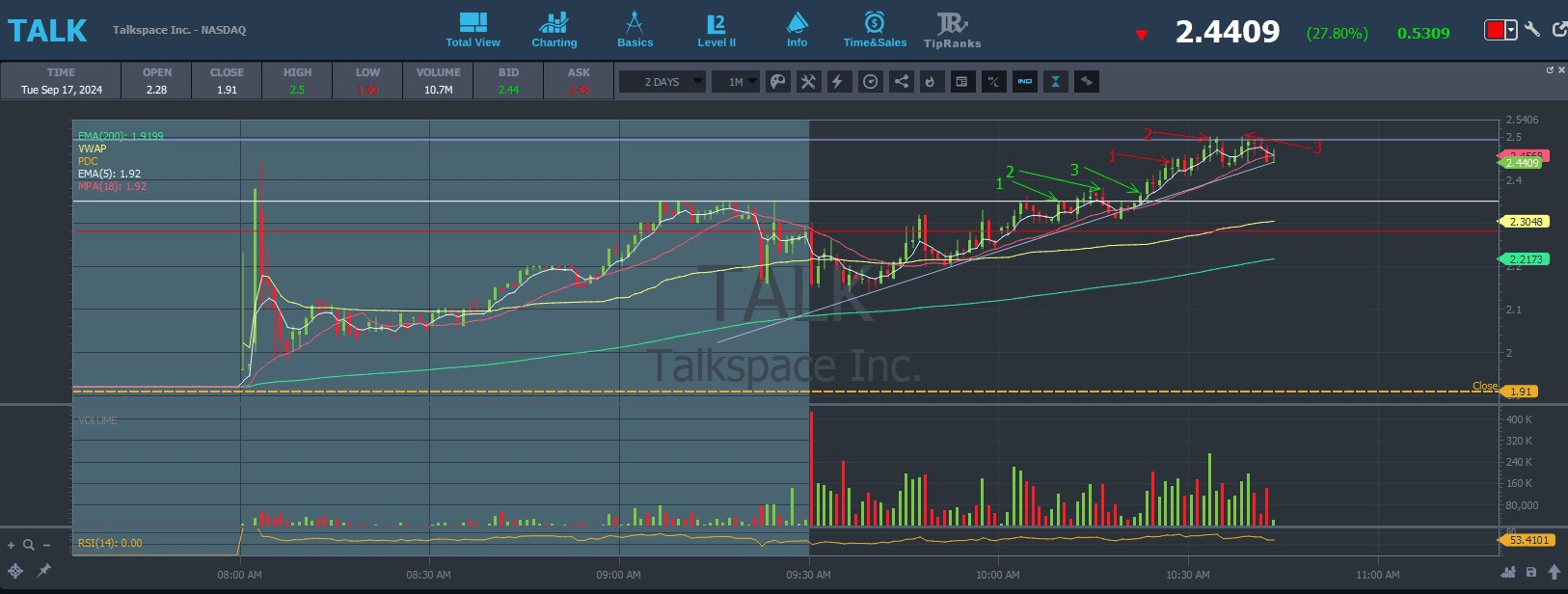 Day. Top % Gainer, BN, & Oracle alert. Entered on a dip buy above VWAP w/100@2.345 (wanted 2.35), risk 2.28, TGT 2.49-2.56 (2-3R). I'm increasing my TGTs to a range now. I added when it broke key resist LVLs; 100@2.3753 (wanted 2.38), & 60@2.37. I then moved risk up to 2.3 day open. Exited 200@2.44 (1st LVL of resist which was planned w/the extra adds, but should've been 160 not 200), next 75@2.49 (1st TGT), then last 25@2.5 after it reclaimed it after short downturn which ended up being top.