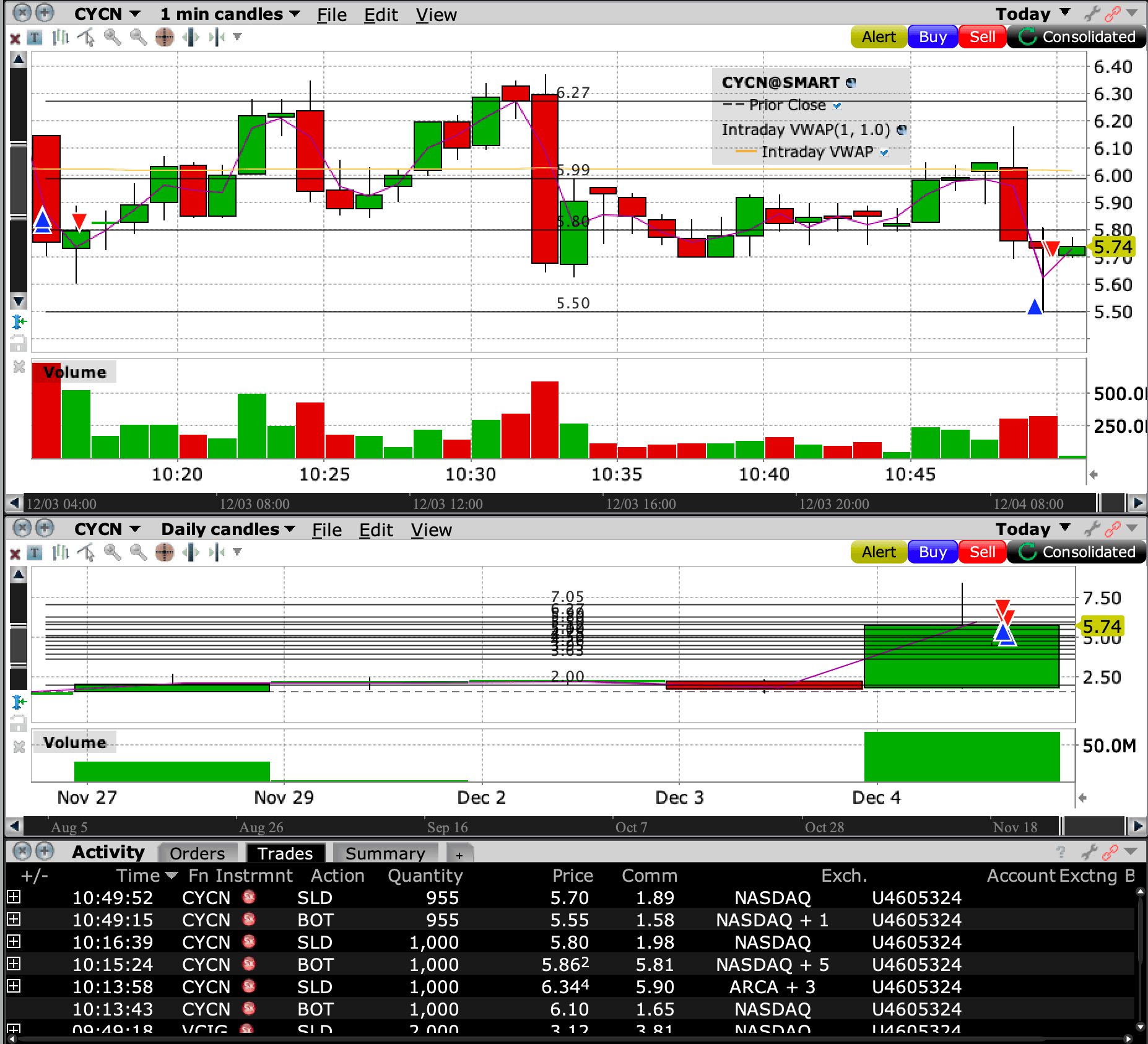 Panic Dip Buy. Just sitting and waiting and not wanting to trade, but then a massive panic came by close to 5.50 support, so I had to take this at 5.55! Excellent buy at max panic and in my usual fashion I left another 20 cents on the table, but so happy with my 15 cents per share win! Scary stock to trade with high volatility, just locking this single in!