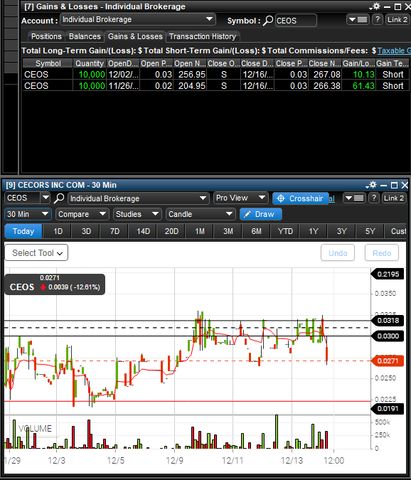 11/26: Catalyst is a conference in December, this stock could see some significant spike. Buying into daily weakness towards .015 support, which is my risk. Looking for a spike to .035, .04, .05. Outside of my wheelhouse, trying with small position. 12/2: added 10K at .025, upgrade risk to .02. 12/16: no push after the mentioned catalyst. Out for peanuts.