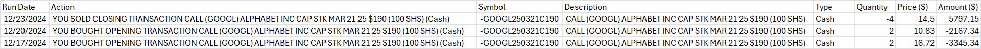 Spyder Trades Recommendation Mar 21 2025 $190 Call Option Symbol: GOOGL250321C190 Entry Comment: Bought 2 contracts @ $16.72, Added additional 2 Contracts @ $10.81, AVG cost $13.765 Exit Comment: Sold 3 contracts @ $14.50, Could have held this option longer but the longer I hold it, the more nervous I grow. Time to cut this option and grab profits