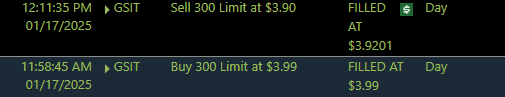 12:02PM jusbeatbox: long $GSIT 300 share 3.99. i'm willing to add 300 shares. if there's a fake out breakdown to the 3.90s but I will cut if it drops to the 3.80s. plan is to exit above 4.20s. but hopefully there's a HOD retest. small size to hold for longer. 12:13PM jusbeatbox: i just cut $GSIT when i told myself i wouldn't if it retested the 3.90 area. gotta work on my nerves. -$21