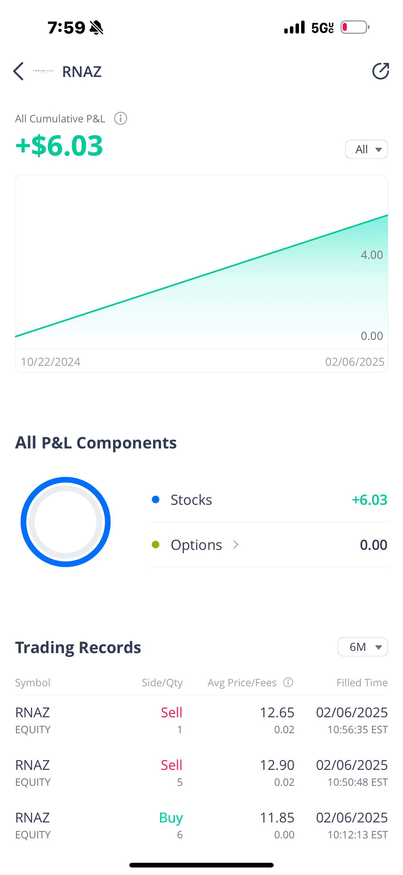 Bought 6 shares for this day trade. Sold 5 at 12.90. Saw candles dipping and options were not looking good considering it had already vwamped in my opinion multiple times throughout post extended hours - before premarket. So as the candles descended and the options pushed it further down, exited my last share at 12.65. Timing is all on 2/06. RNAZ is a rare one, i rarely do any during the market and I bought all 6 shares during market open.