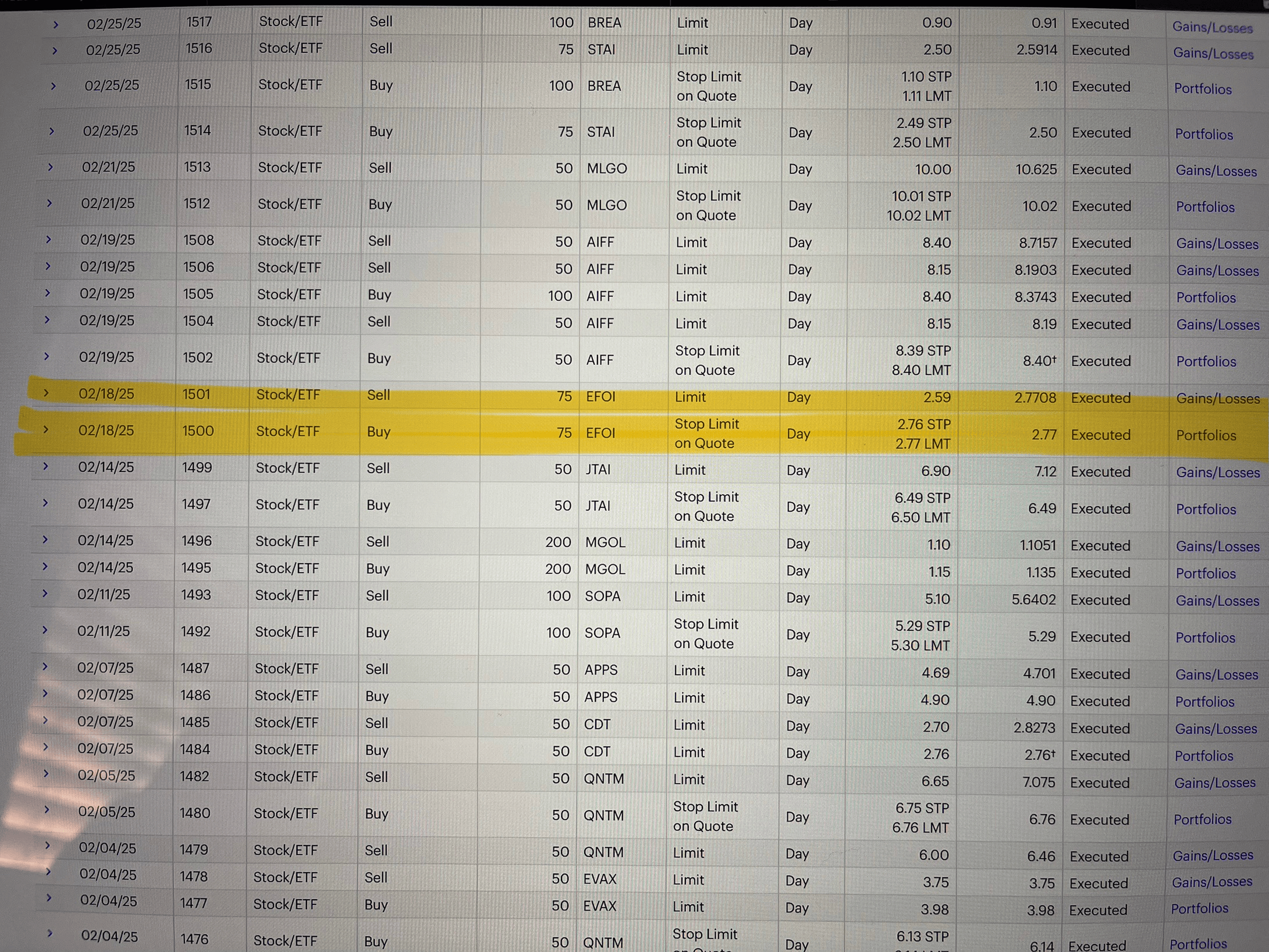 Entry date Feb 18, 2025: Bought 75 shares of EFOI for $2.77. Afternoon VWAP hold HOD break play, bought when it broke HOD/52W high, big % gainer, momentum mover, 17.1x float rotation, 3.64M float, former runner, FGD. Goal was .30¢ upside. Risk/reward was 1:2, .15¢ downside .30¢ upside. Exit date Feb 18, 2025: Sold 75 shares of EFOI for $2.7708. Gave it some time, couldn’t squeeze, kept having top wicks, sold to break even, panicked right after.