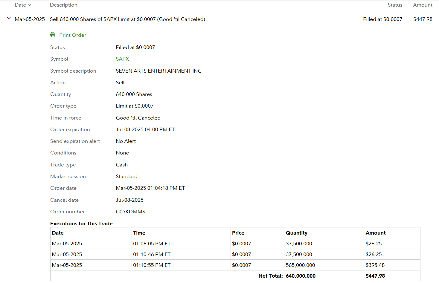 I got in this trade because of a PR alert from my STT pre-sets that I have on former runners. Dip bought 4/10 8:59 $0.0011 160k at 8:30 LOD & 27% off 8:48 $0.0015 HOD. Price faded. Added 4/12 10:28 $0.0009 160k & 11/7 8:44 $0.0002 320k on the floor. Volume returned 2/13. Seeing the intimidating 13M wall on the $0.0008 Ask, I got out 3/5 12:06/12:10 $0.0007.