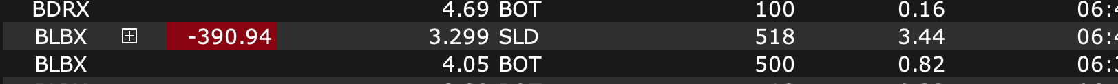 I had entered around 3.89 with 18 share I wanted a 100 share.furthmore I add 500 share at 4.05 BLBX was up a 120 I did take my profile and it drop I had so many chance to loss $5 but I was revenge trading. ended up taking the biggest lost on my small account I did not do no research. I NEED TO TRADE WELL AND SURVIVE THIS YEAR,I NEED TO BE DISPLINE