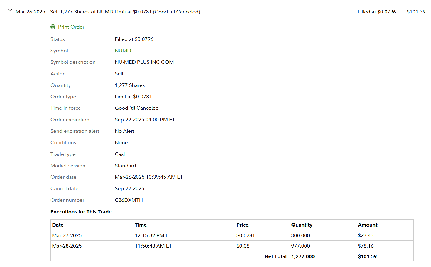 SUPER SALE STRATEGY per my 2/27/21 Profitly blogpost. Dip bought 3/26 8:30 $0.0651 [using a Limit Buy at $0.066] partial fill 1,277 shares [wanted 3k] 52% off 3/25 $0.135 HOD. No volume at all on 3/26 with Ask at $0.08 so I immediately got on the Ask at $0.0781 for the 20% win & Fidelity got me out 3/27 11:15 $0.0781 300 & 3/28 10:50 $0.08 977. Only 41,935 shares traded today yikes STAY AWAY!