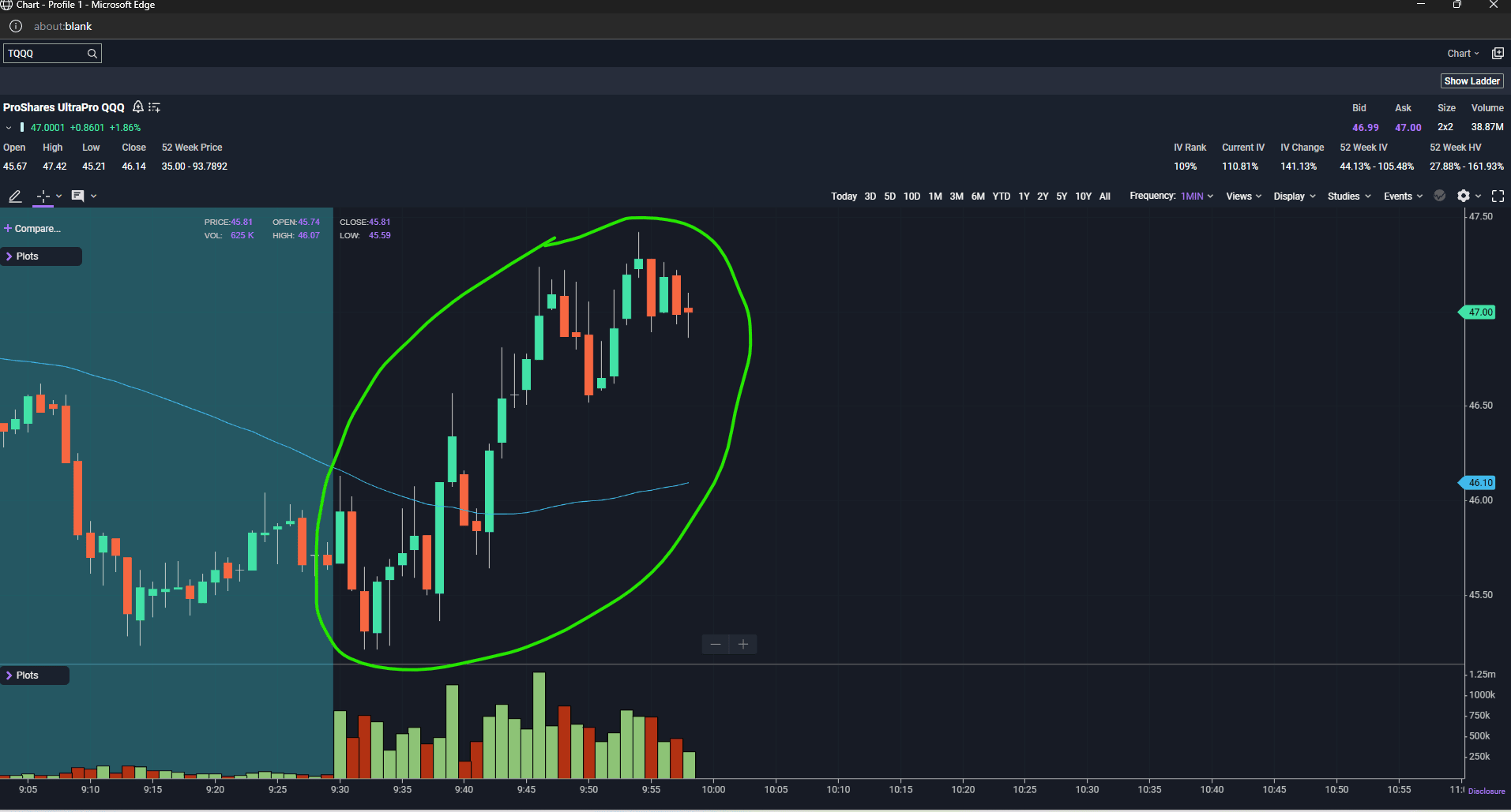 Sized into and out of this trade based on the price action, buying into dips and selling into breakouts. Kind of like riding a wave. Exited when it looked like it couldn't break out and went below my mental stop loss. May switch over to SQQQ if it changes direction. Markets are so volatile because of tariff situation. Nice range but looks mostly choppy.