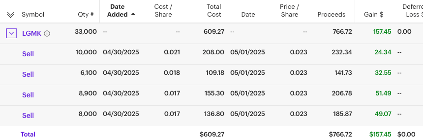 After the last trade on this ticker, it fell to .013 on after hours. I didn't have any settled cash to rebuy. I watched for a return to that level in the PM or looked for a new entry. It fell well off the HOD so I grabbed some for an average of .0184. I missed 2 exits today in the .024s and held because there was no great sell off and volume was high. Sold for safe profits. It bounced to .0247 and then down to .0216. Happy with the exit.