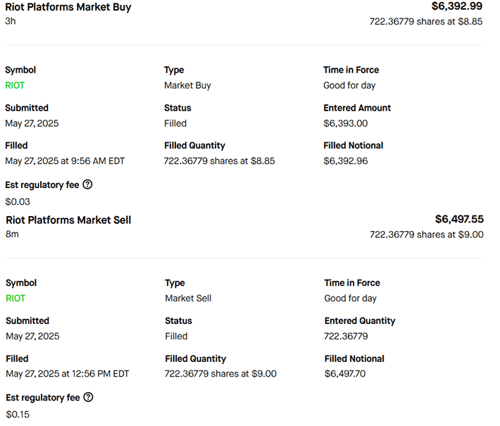 Everything was up this morning. If I was a chaser, I would have lost a lot, because everything came back down. My initial watch was with DJT. Up over 10%. It dropped and never came back. Several others did continue with little to no pullback. RIOT was trailing MARA, though not as strong. Going off what MARA was doing, I waited until RIOT broke & held above 9EMA & RSI held above. There was a slight dip after, then started a slow climb. Took profit before a dip. Solid trade. Still climbing now.