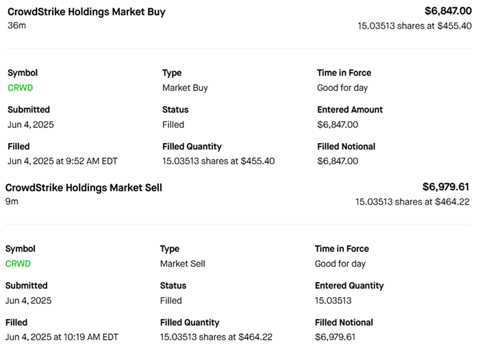 CRWD bounced after the 7+% drop after earnings. Once it confirmed above the 9EMA and moving, I was in. It did drop once below my entry for a quick minute. Then, hit my goal quickly and still showed signs of strength. I could have held longer. I'm happy with my 1.94% gain. As I write this, it's now, it's hitting $467-468.